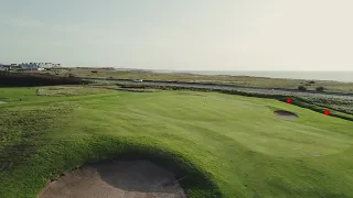 Par 4 face au vent avec une mise en jeu par dessus la mire (uniquement pour les boules noires) pour un deuxième coup pas trop long, plus ou moins par dessus le bunker de gauche, vers un green tout en dévers vers la droite. Attention au ruisseau et au hors limites à droite et derrière de green.